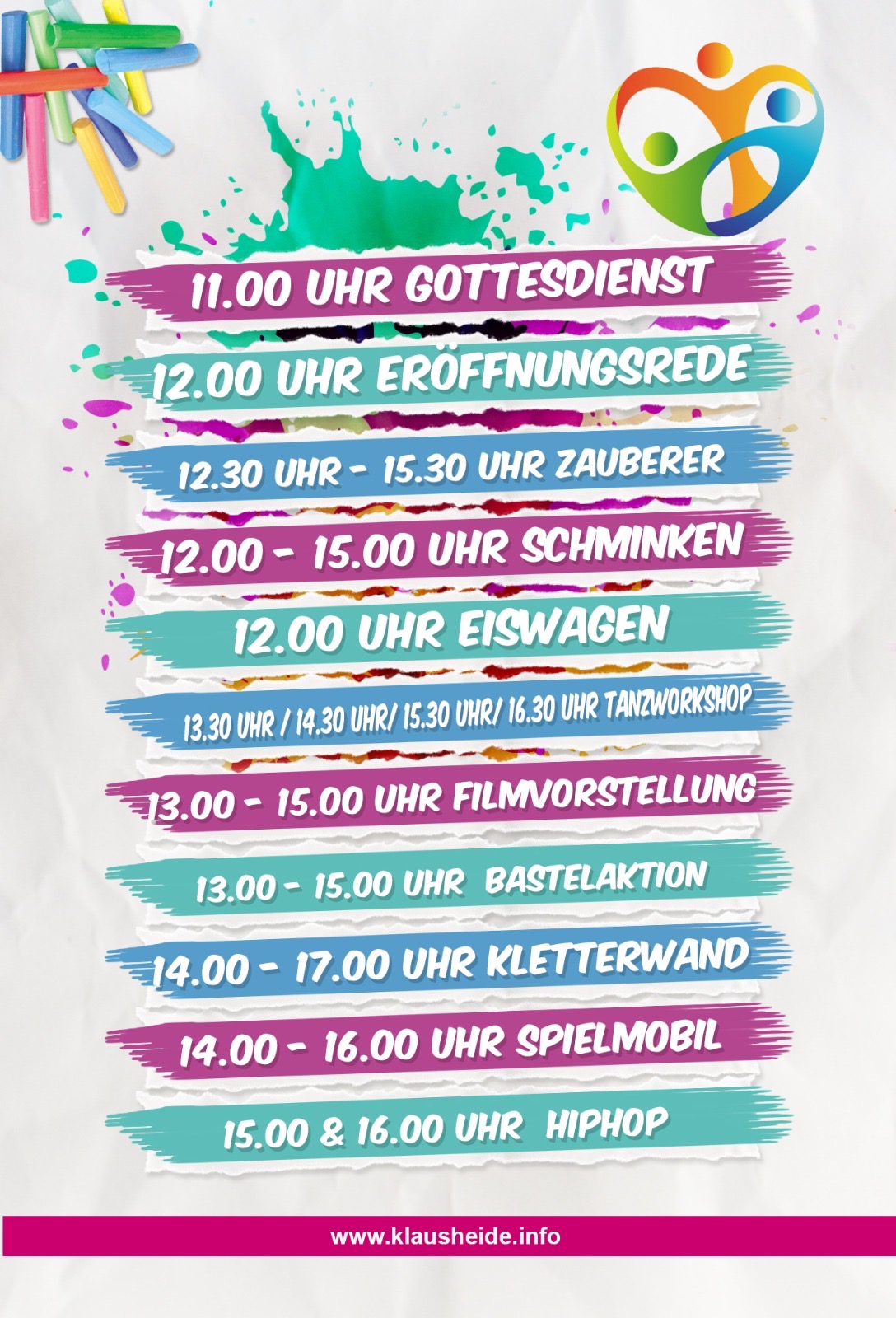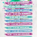Um 11 Uhr beginnt der ökumenische Gottesdienst, woraufhin ihr euch unter anderem über ein riesiges Kuchenbuffet, eine Hüpfburg, Kinderschminken, einen Ballonkünstler, Tanzvorführen und -Workshops, sowie leckeres Essen und Trinken freuen könnt.